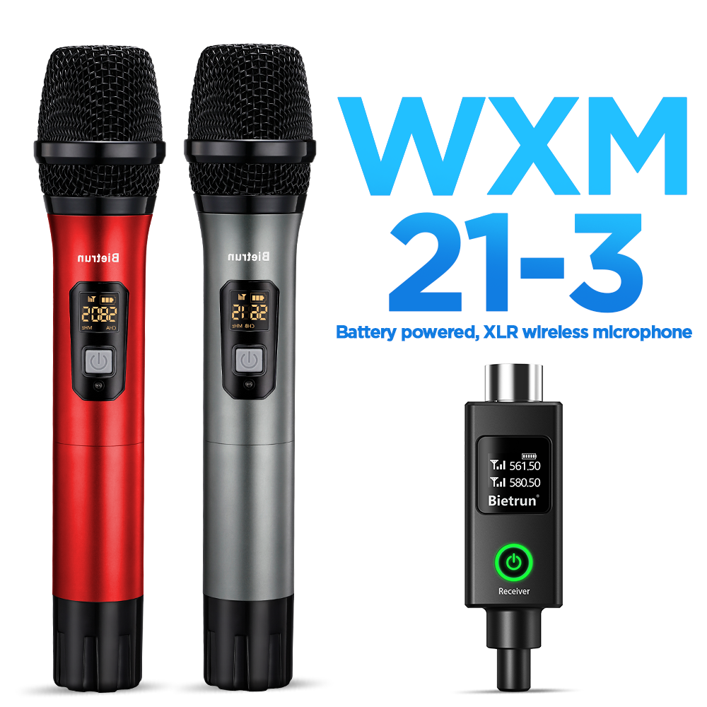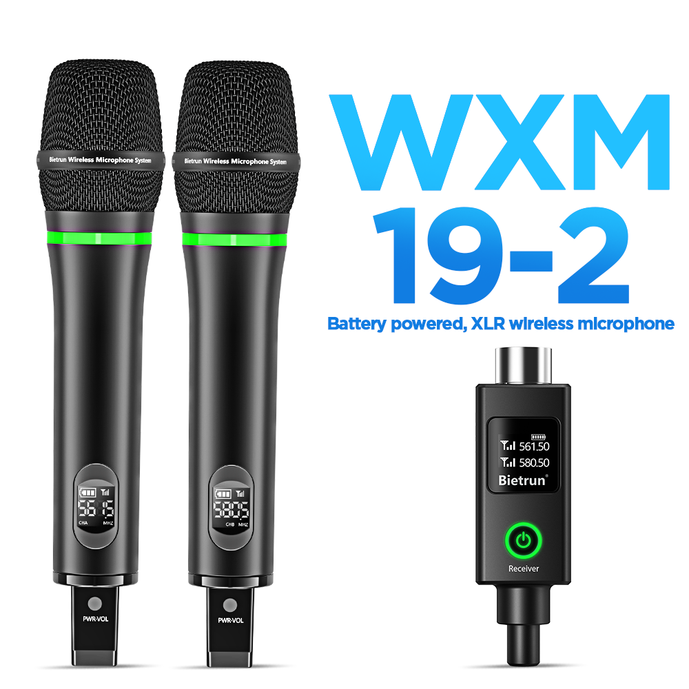 Micrófono inalámbrico Bietrun XLR, micrófonos dinámicos de mano inalámbricos de metal duales recargables para mezclador, interfaz de audio, sistema de amplificación PA, iglesia, canto, karaoke (alcance UHF de 73 m) (con adaptador de 6,35 mm)
