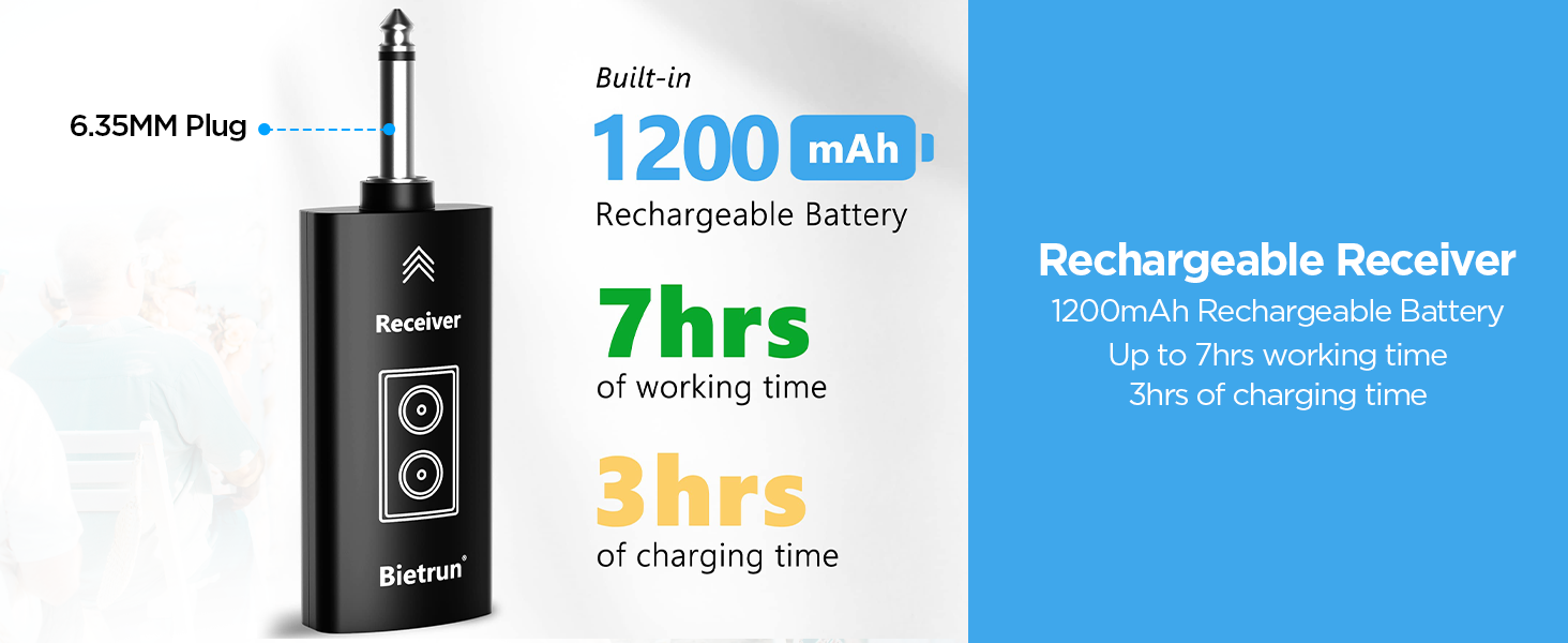 Micrófono inalámbrico Bietrun, sistema dinámico inalámbrico de mano dual de metal UHF profesional con receptor recargable, salida de 1/4'', Plug and Play, micrófonos inalámbricos para instrumentos, karaoke y bodas.