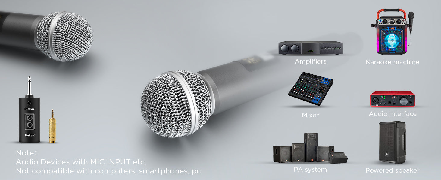 Micrófono inalámbrico Bietrun UHF WXM02/WXM04 con batería recargable de 720 mAh, alcance de 50 m y salida de 1/4" para karaoke, sistema de altavoces y mezclador.