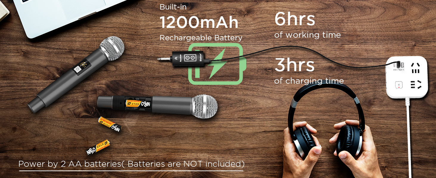 Micrófono inalámbrico Bietrun, micrófono de mano dual UHF dinámico de metal con receptor recargable, salida de enchufe de 1/4'', para karaoke, iglesia, bodas y fiestas (alcance de 30 m) (conexión automática)