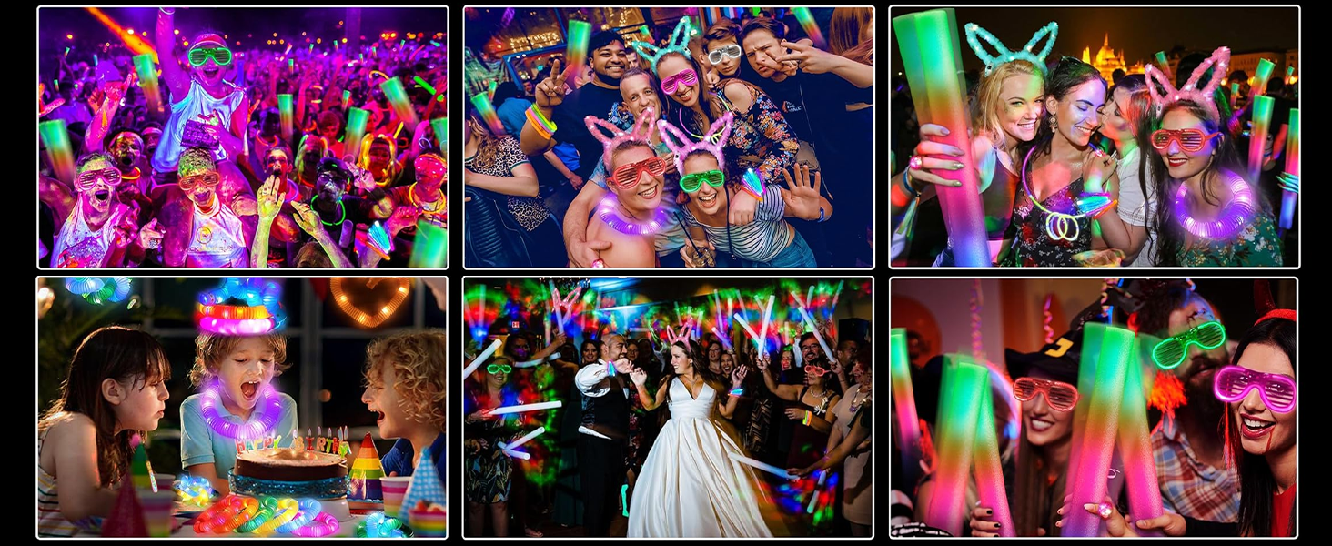 138 piezas de suministros para fiestas que brillan en la oscuridad, 10 barras luminosas de espuma, 50 barras luminosas, 10 gafas LED, 10 diademas con orejas de conejo LED, 20 anillos LED, 18 tubos pop, 20 pulseras LED