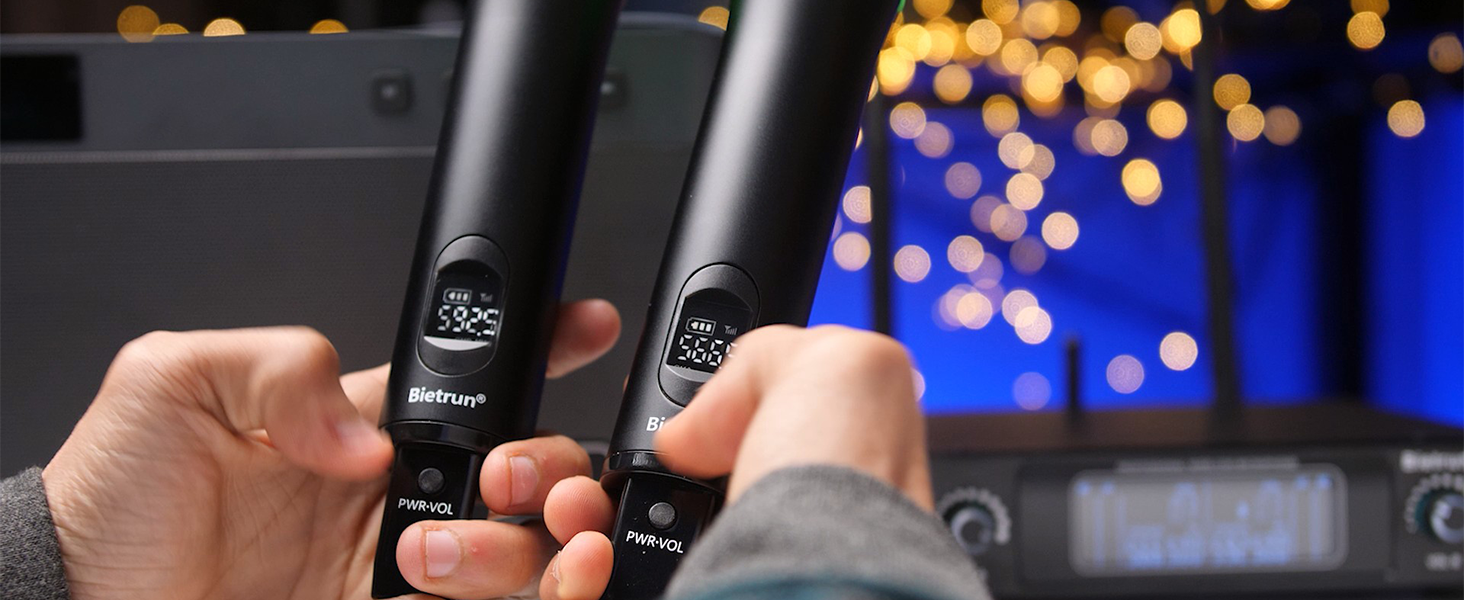 Micrófono inalámbrico Bietrun, sistema dinámico inalámbrico de mano dual de metal UHF profesional con receptor recargable, salida de 1/4'', Plug and Play, micrófonos inalámbricos para instrumentos, karaoke y bodas.