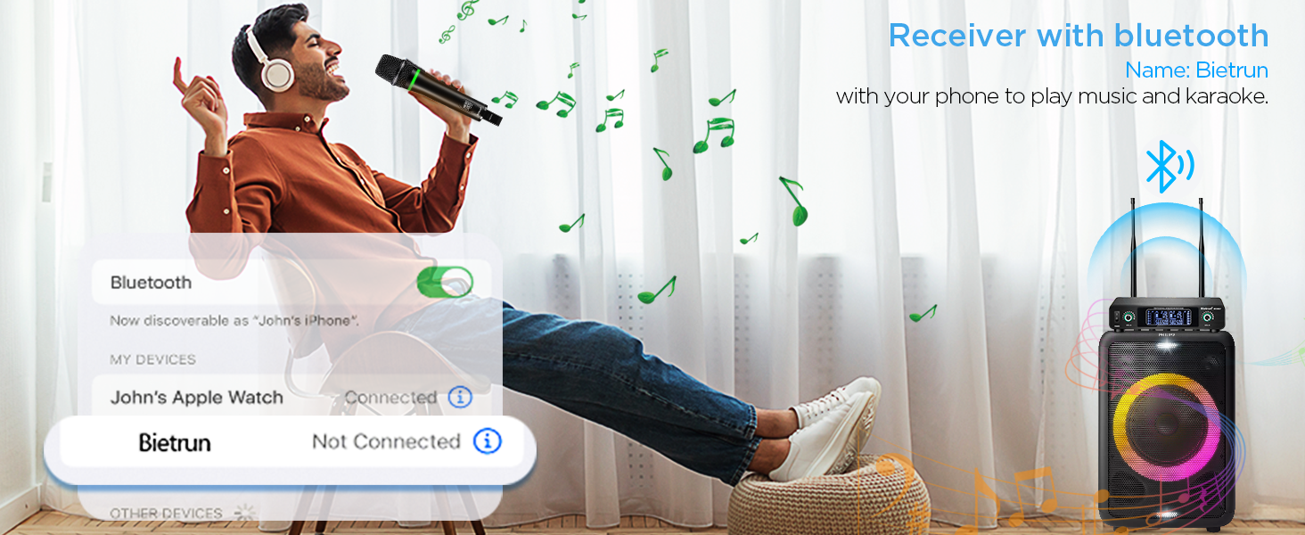 Micrófonos inalámbricos Bietrun con eco, agudos, graves y Bluetooth, alcance de 160 pies, sistema de micrófono dinámico de karaoke portátil UHF de mano con receptor recargable para karaoke, canto, amplificador, sistema PA, DJ, escenario