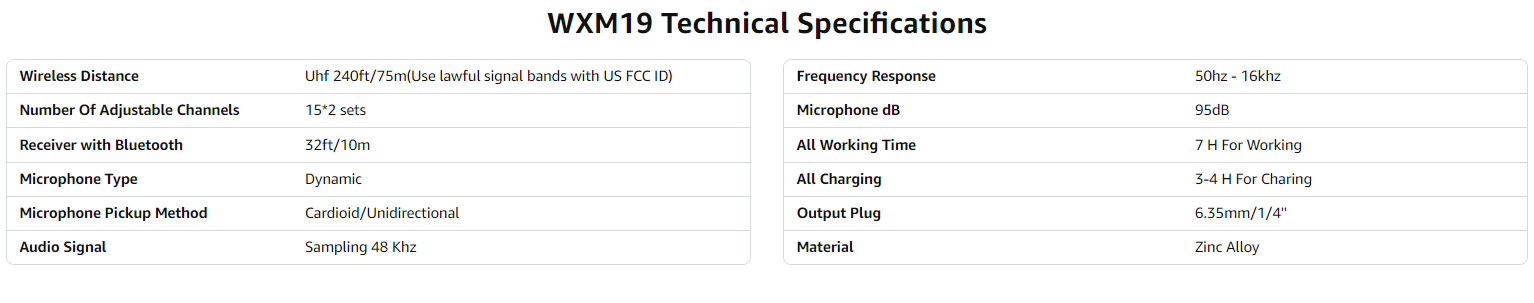Micrófono inalámbrico Bietrun UHF WXM02/WXM04 con batería recargable de 720 mAh, alcance de 50 m y salida de 1/4" para karaoke, sistema de altavoces y mezclador.