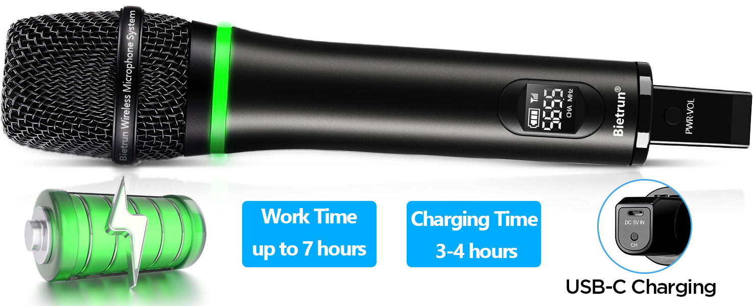 Micrófono inalámbrico Bietrun, UHF, de mano, dinámico, metálico, con receptor recargable y salida de enchufe de 1/4'', para karaoke, iglesias, bodas y fiestas (alcance de 30 m) (conexión automática)