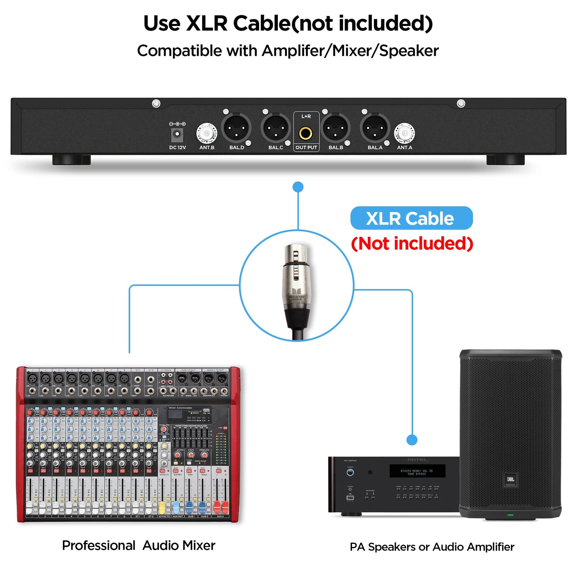 - Plug and Play, fácil de configurar: ● El receptor tiene micrófono de 6,35 mm y salida XLR A/B/C/D de 4 canales. ● Puede elegir un cable de 6,35 mm (incluido) o un cable XLR (no incluido) que necesita para conectar el otro lado a Partybox, amplificadores, DJ, mezcladores de audio, sistema PA, máquina de karaoke, equipo multimedia, etc.