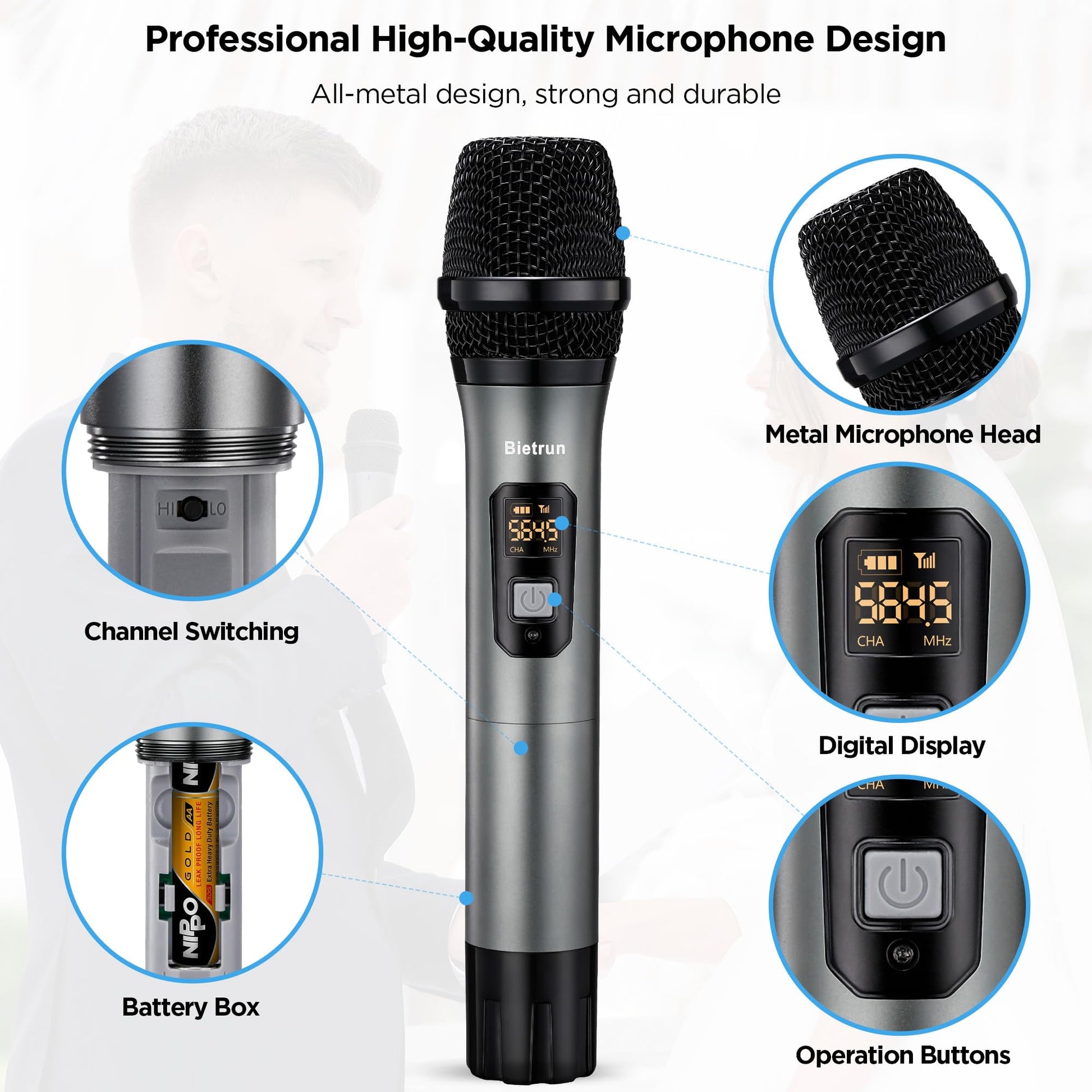Micrófonos inalámbricos Bietrun con eco, agudos, graves y Bluetooth, alcance de 160 pies, sistema de micrófono dinámico de karaoke portátil UHF de mano con receptor recargable para karaoke, canto, amplificador, sistema PA, DJ, escenario