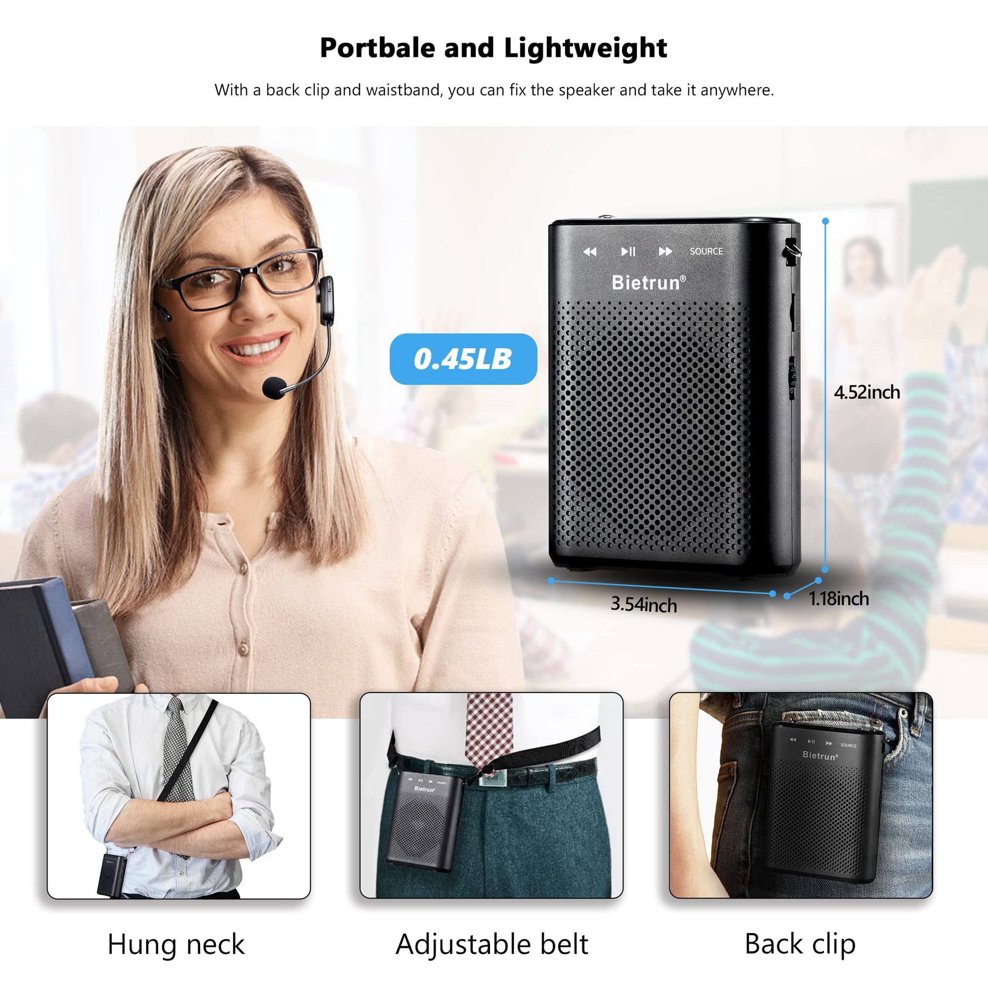 - Portátil, ligero y compacto: Este altavoz es un sistema de megafonía portátil. Pesa solo 204 g y cuenta con un clip trasero para sujetarlo al cinturón o bolsillo. También puede colgarlo de la cintura con el cinturón incluido. Ideal para cualquier entorno, desde interiores hasta exteriores. Ideal para profesores, entrenadores, formación, presentaciones, guías turísticos, aulas, etc. Resulta de gran ayuda para hablar con más de 50 miembros de su grupo.