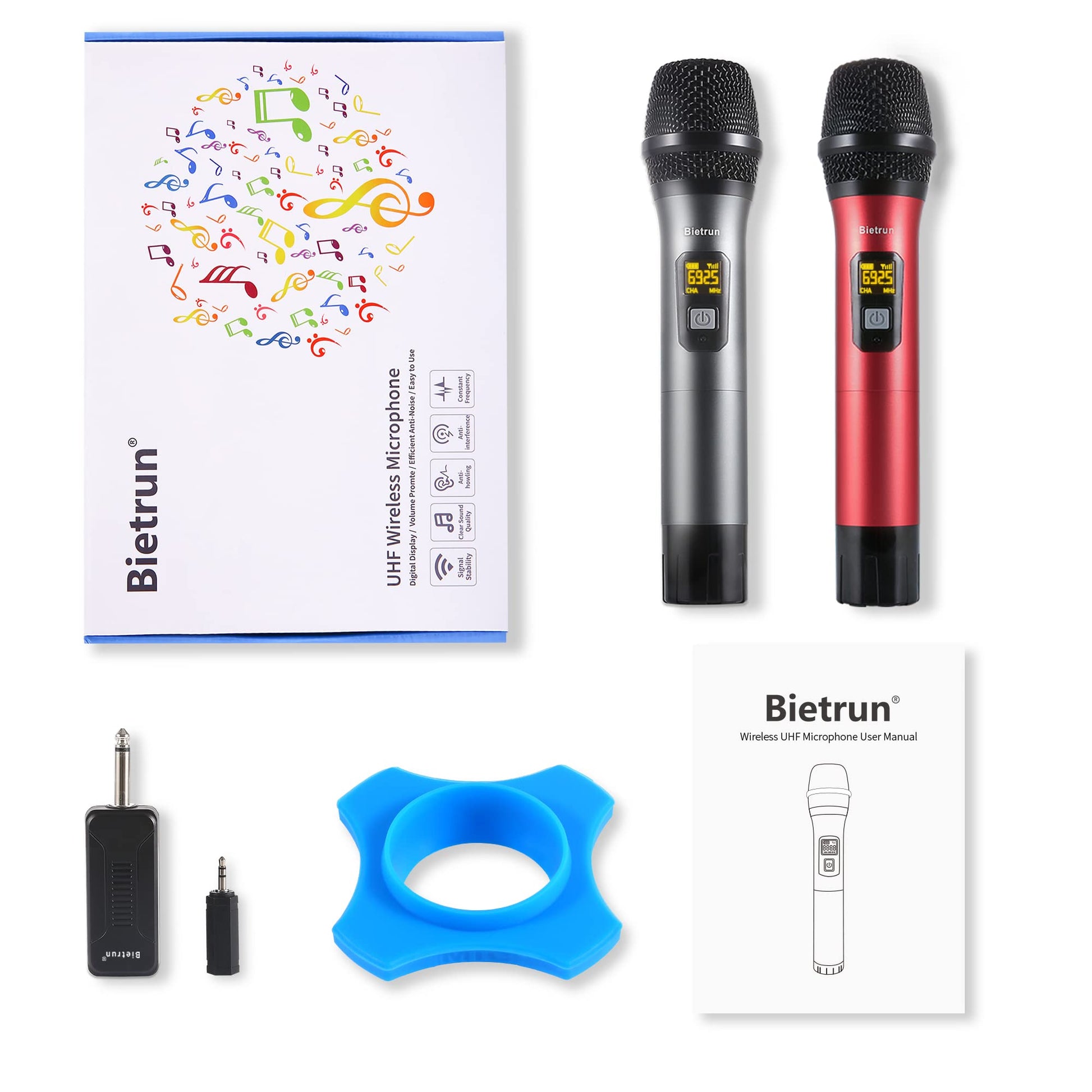 Micrófono inalámbrico Bietrun, UHF, de mano, dinámico, metálico, con receptor recargable y salida de enchufe de 1/4'', para karaoke, iglesias, bodas y fiestas (alcance de 30 m) (conexión automática)
