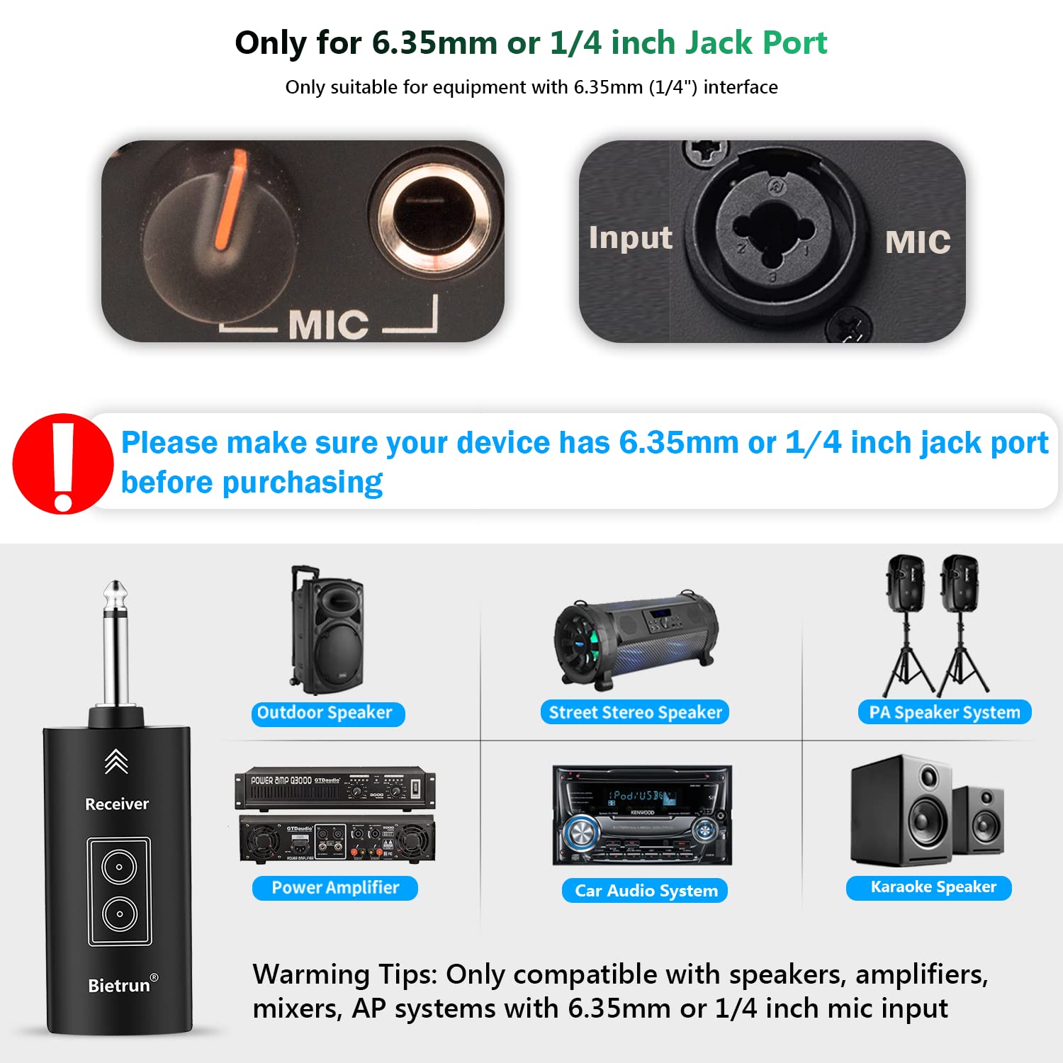 - CONECTAR Y USAR: El micrófono y el receptor se conectan automáticamente. El receptor se puede conectar a equipos con entrada de micrófono de 6,35 mm, como altavoces, máquinas de cantar, amplificadores de audio, sistemas de sonido, amplificadores de voz, mezcladores, interfaces de audio, sistemas de altavoces para camiones, sistemas de altavoces tipo domo, etc.