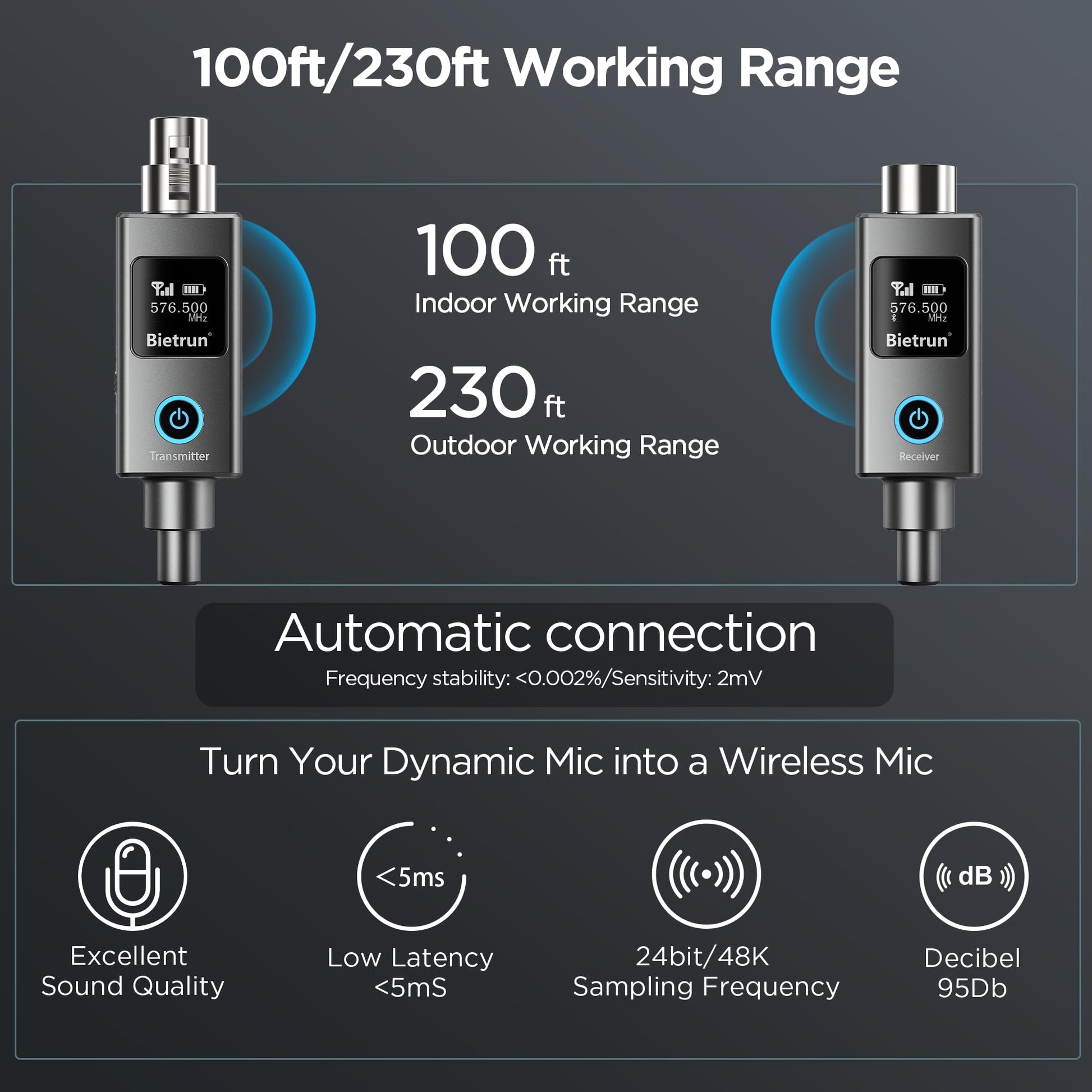- Alcance de transmisión estable de 30 a 70 metros: El sistema de micrófono inalámbrico XLR opera en la banda de frecuencia UHF, lo que proporciona un alcance de transmisión confiable en interiores de hasta 50 m (100 pies) y en exteriores de hasta 70 m (230 pies). Especificaciones técnicas adicionales: Estabilidad de frecuencia: <0,002 %. Sensibilidad: 2 mV. Relación señal-ruido: >95 dB. Rechazo de interferencias: >90 dB.