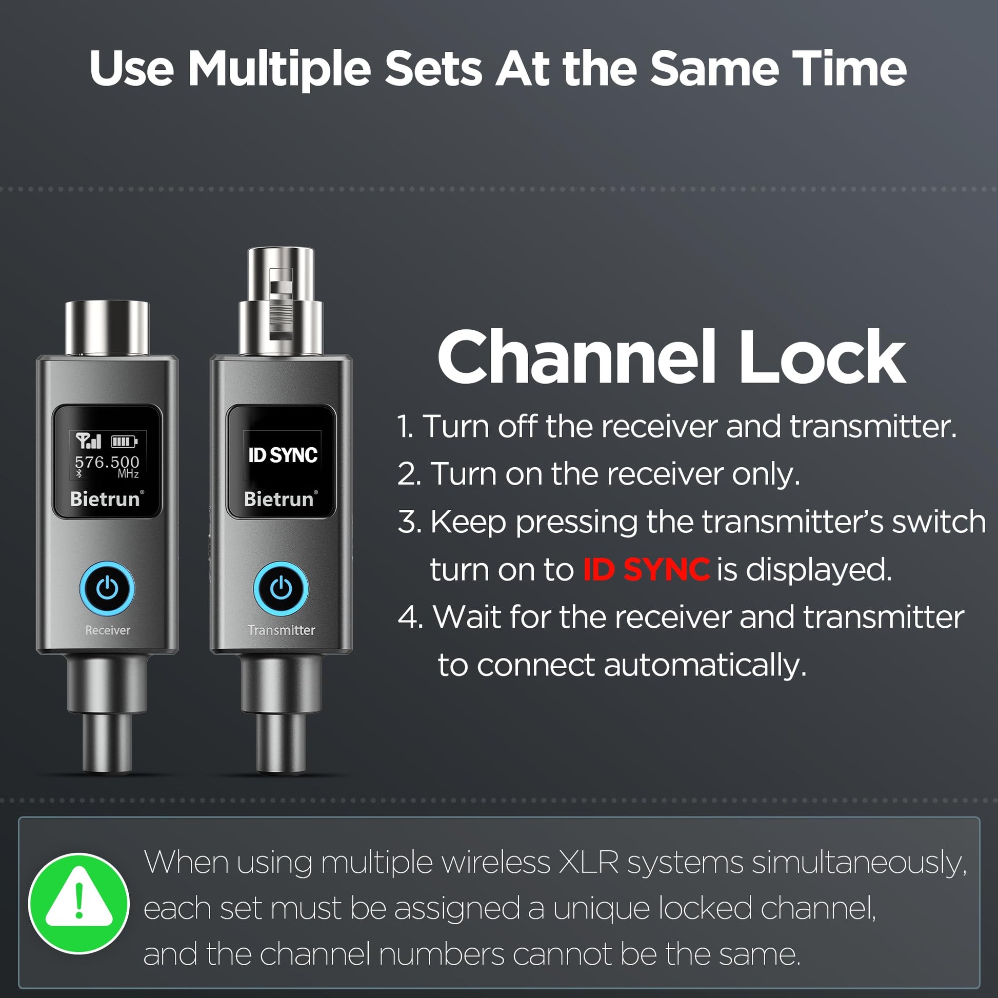 - Uso de varios equipos simultáneamente: ● Bloqueo de canal: ● 1. Apague el receptor y el transmisor. 2. Encienda solo el receptor. 3. Mantenga pulsado el interruptor de encendido del receptor hasta que aparezca ID SYNC. 4. Espere a que el receptor y el transmisor se conecten automáticamente. (● Al usar varios sistemas XLR inalámbricos simultáneamente, cada equipo debe tener asignado un canal bloqueado único, y los números de canal no pueden ser iguales).