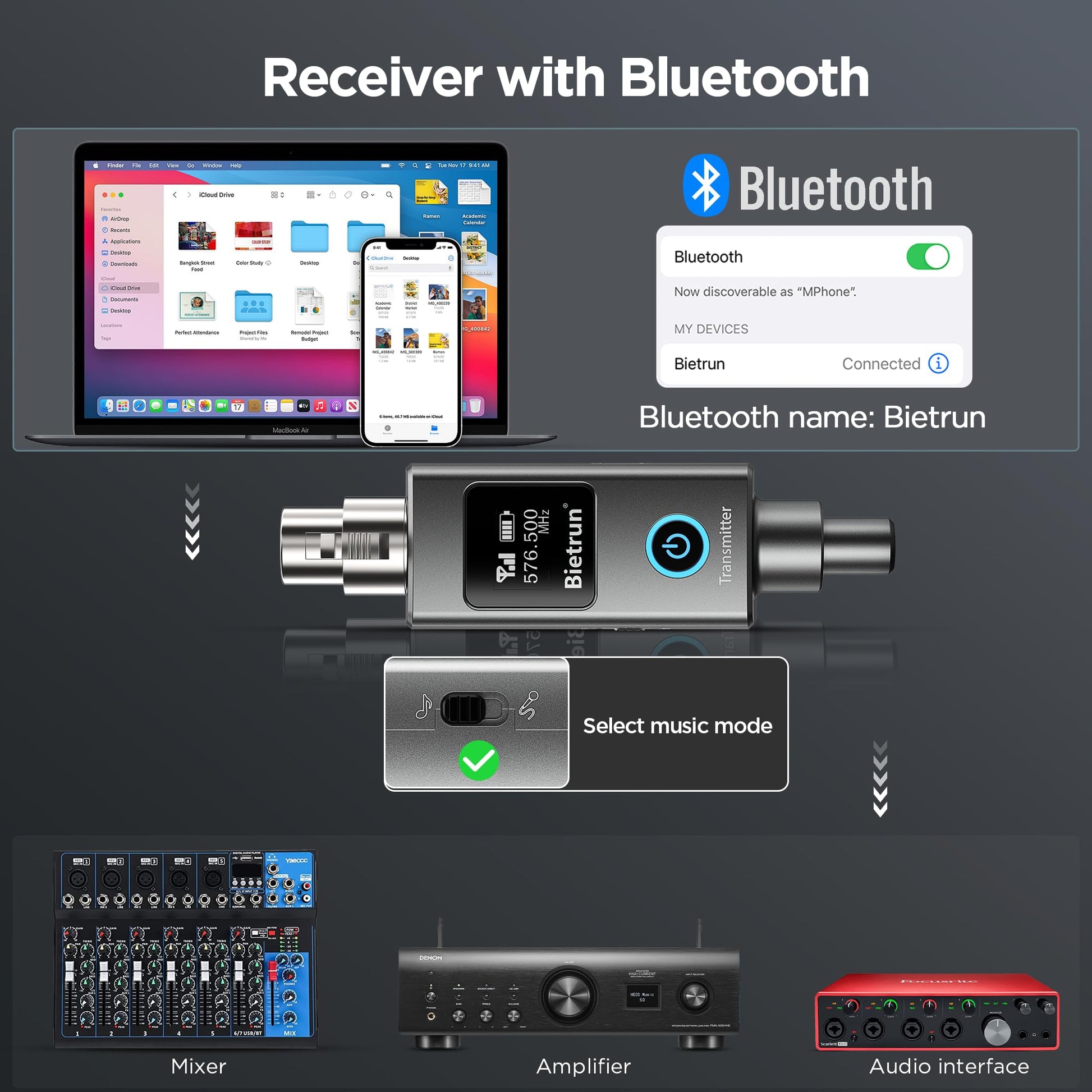 - Receptor con Bluetooth: ● Puede conectar su smartphone, smart TV, tablet o portátil al receptor mediante Bluetooth. Luego, simplemente conecte el receptor a un altavoz u otro dispositivo con interfaz XLR o de 6,35 mm para reproducir música. ● Este receptor y transmisor también funciona como un cable de transmisión XLR inalámbrico, lo que le libera de las limitaciones de los cables XLR tradicionales. (● Nota: Al utilizarlo para transmisión de audio, es esencial cambiar el receptor al modo de audio).