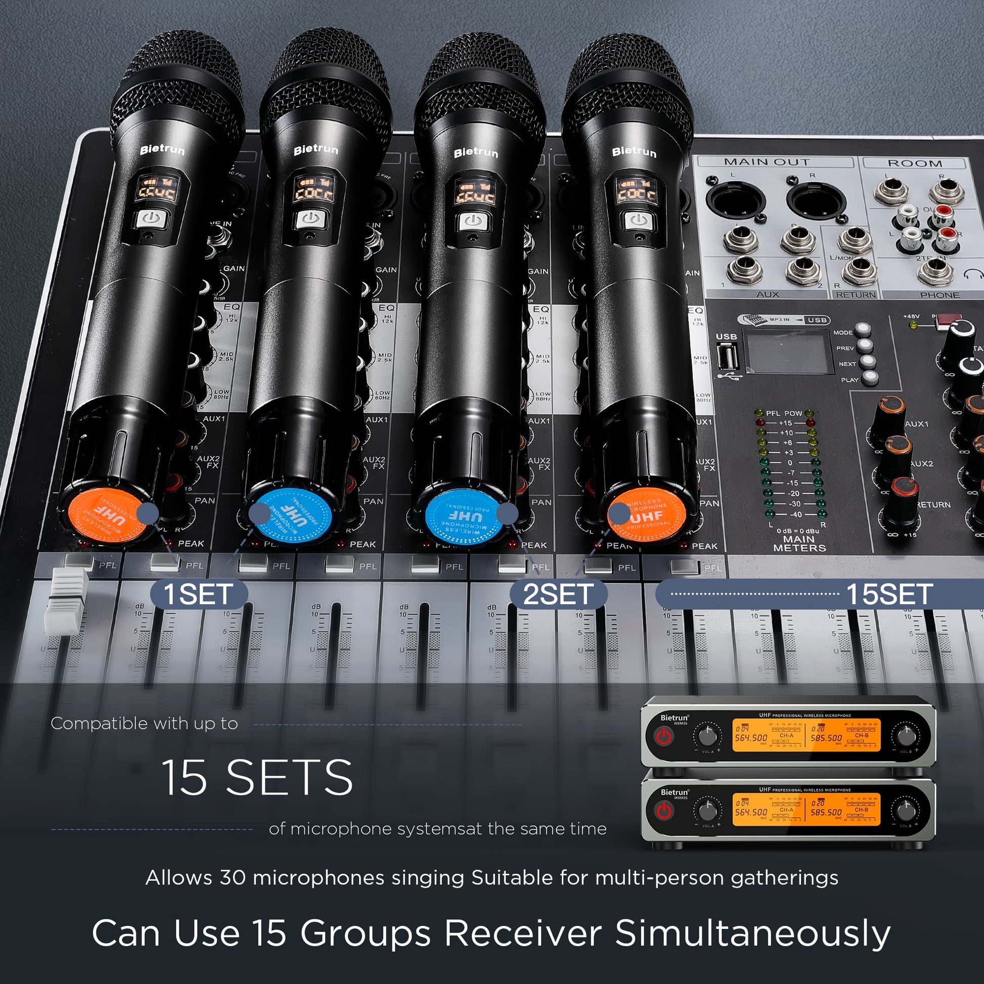 Micrófonos inalámbricos Bietrun con eco, agudos, graves y Bluetooth, alcance de 160 pies, sistema de micrófono dinámico de karaoke portátil UHF de mano con receptor recargable para karaoke, canto, amplificador, sistema PA, DJ, escenario