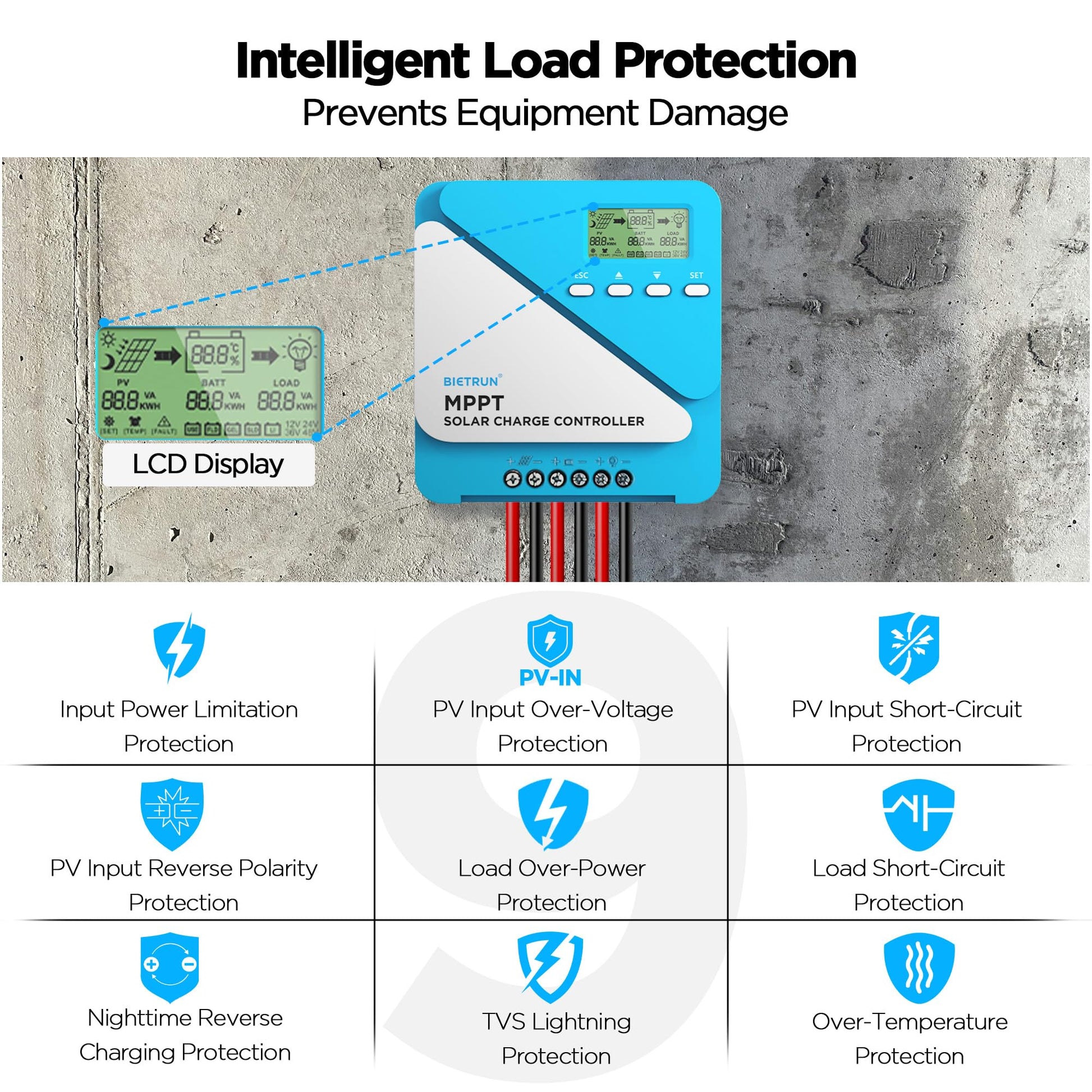 - 9-Layer Intelligent Protection: Input Power Limitation, PV Over-Voltage Protection, PV Short-Circuit Protection, PV Reverse Polarity Protection, Load Over-Power Protection, Load Short-Circuit Protection, Nighttime Reverse Charging Protection, TVS Lightning Protection, and Over-Temperature Protection. The controller actively monitors the solar panel’s current output and automatically intervenes to ensure device safety