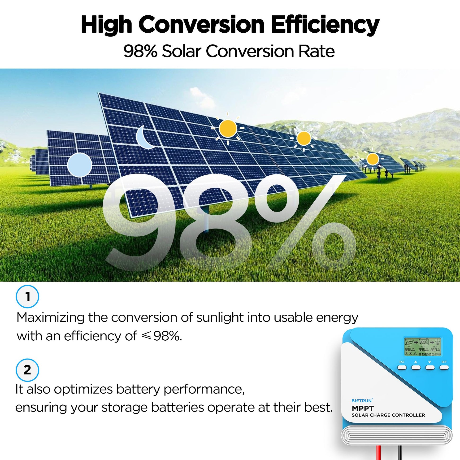 - Conversion Efficiency ≤98%: Built with the latest 2025 smart solution, the MPPT solar charge controller maximizes sunlight conversion into usable energy with up to 98% efficiency. It also optimizes battery performance, ensuring your battery operates at its best.