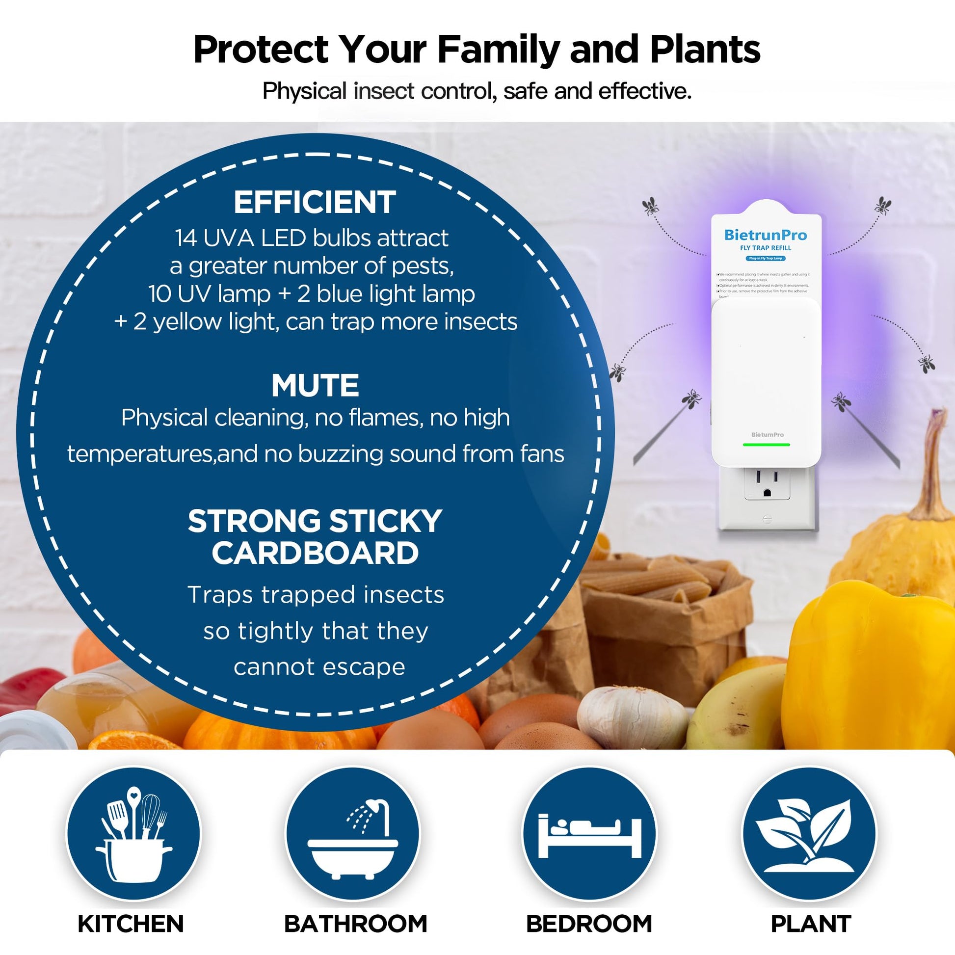 - Upgrade the Light to Increase Attraction: Compared with other insect traps, it adds (10 UV + 2 Blue + 2 Yellow) lights to attract more insects. Combined with super sticky board to catch more pests. UVA Light: Highly effective at attracting moths, mosquitoes, fruit flies, beetles, and mayflies.Blue Light: Particularly appealing to bees, houseflies, tropical beetles, and termites.Yellow Light: Especially effective for drawing in aphids and certain moth species.