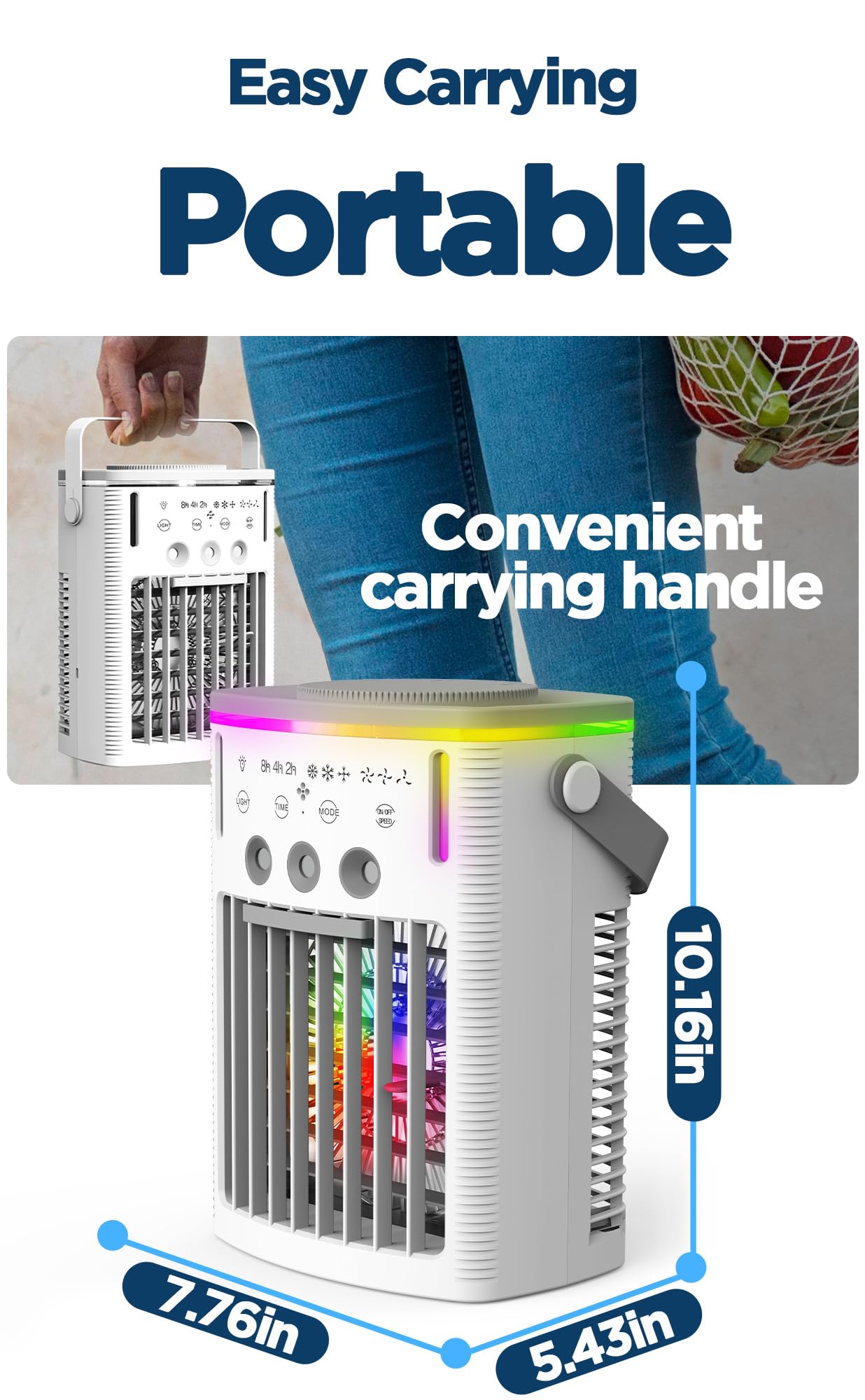 - 🌬️ 4-in-1 Functionality – Fan, Air Cooler, Humidifier & Colorful Night Light: 🌀 Fan Mode:** Enjoy a refreshing breeze without adding water.❄️ Air Cooler Mode:** Add water for an extra cooling effect.💧 Humidifier Mode:** Press the humidifier button for a cool mist that helps relieve dryness.🌈 Colorful Night Light:** Built-in RGB light strip creates a soothing and vibrant ambiance in your room.