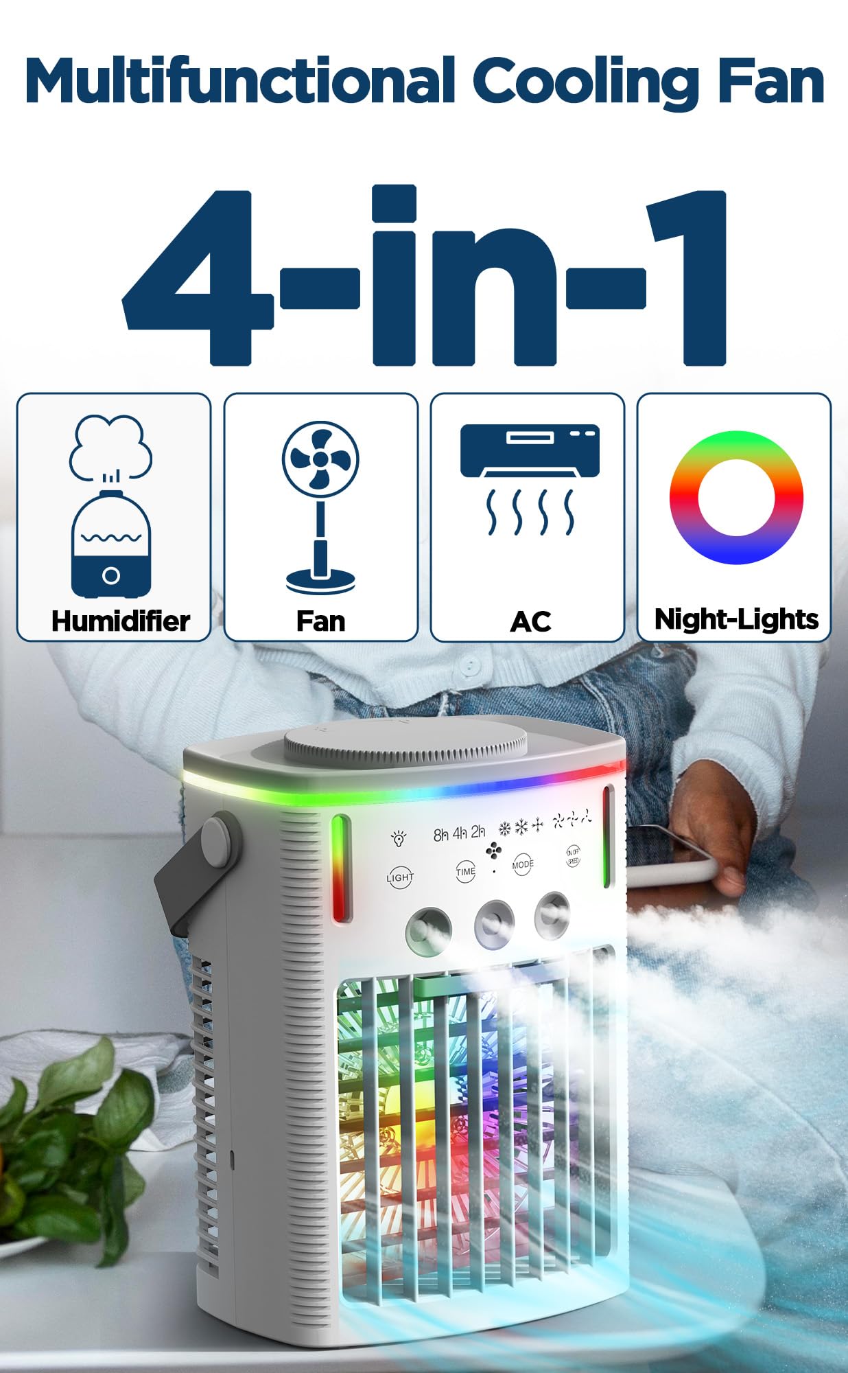 Portable Air Conditioners Fans, 4 in 1 Humidifier/Air Conditioner/Fan/Night Light, 3 Wind Speed & Spray, 2-8H Timer, Personal Mini Evaporative Air Cooling Fan with Remote, for Home/Office/Bedroom